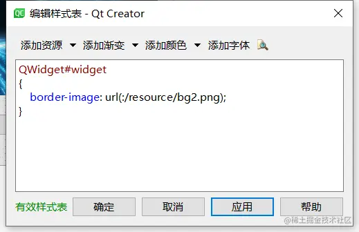 一句话就搞定了,这里使用border-image属性可以让图片平铺到窗口,效果与第二点一样。不过在本例中由于Widget是顶层窗口,所以直接设置样式表也不会显示。所以样式表比较适合子窗口来使用。