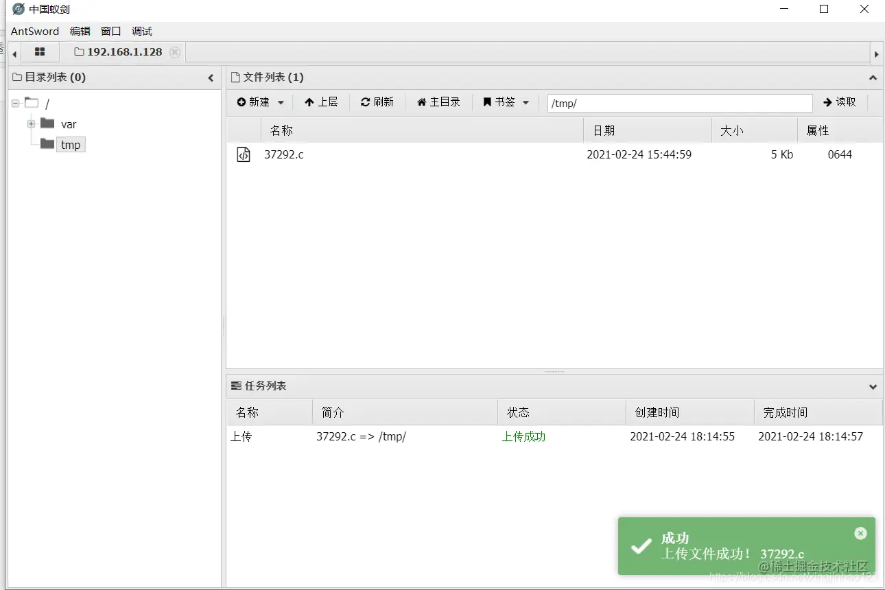 使用中国蚁剑连接成功,上传反弹shell的php文件