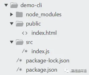 新建src和public文件夹,分别用于存放源代码和静态资源,并初始化创建src/index.js和public/index.html文件。完成后项目结构如下: