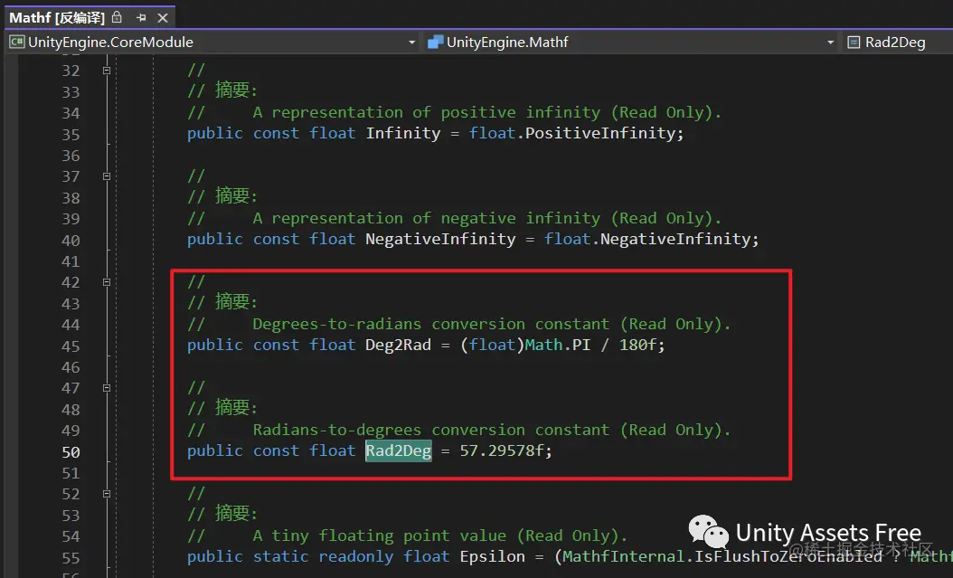 在Unity中就直接提供了两个常量来帮助我们实现角度与弧度互转