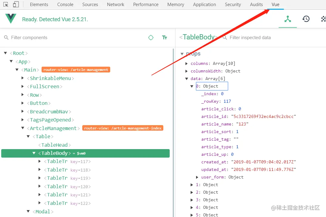 然后按f12打开开发者工具,找到我们工具栏中的vue选项。于是乎便能清晰的看到我们的vue组件。