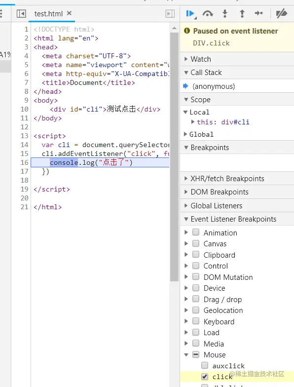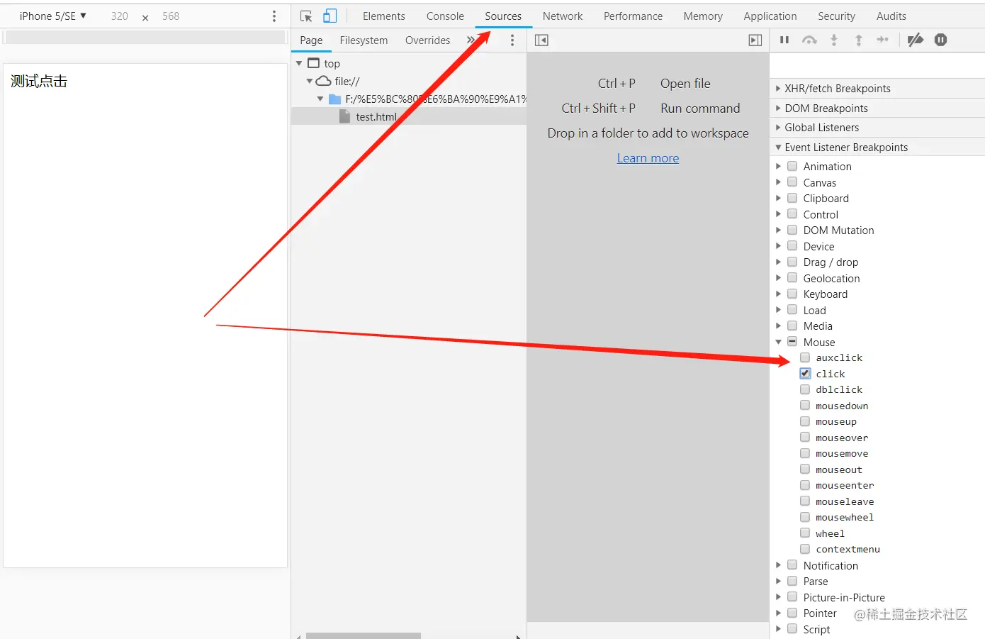 在浏览器中打开文件,然后按f12找到sources选项卡,比如我要监听点击事件。选择mouse将click打上钩。