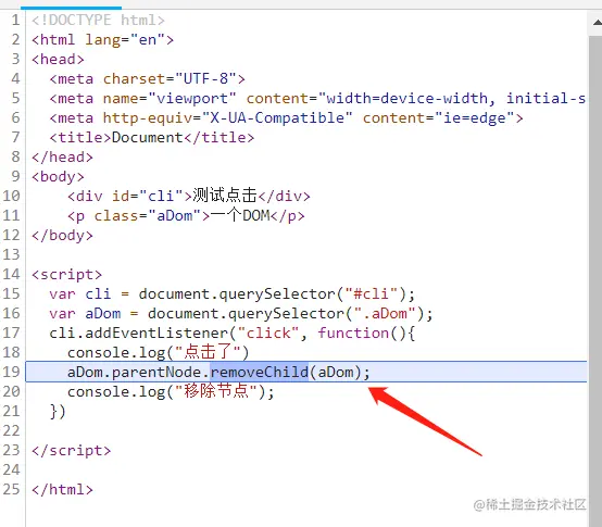 当我们点击测试点击的时候,会将一个DOM给删除。于是会在删除的代码中实现断点