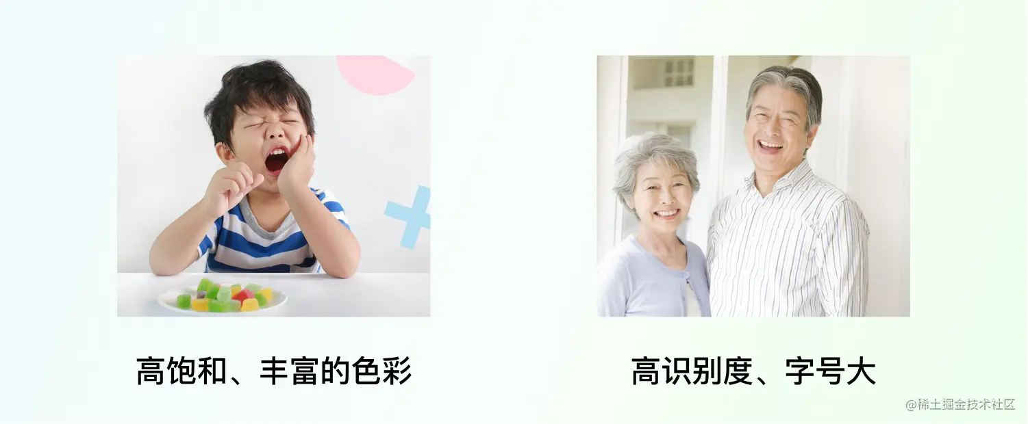 小孩喜欢高饱和、丰富的颜色,而老人则需要考虑在各种场景下都能看得清楚信息的颜色。