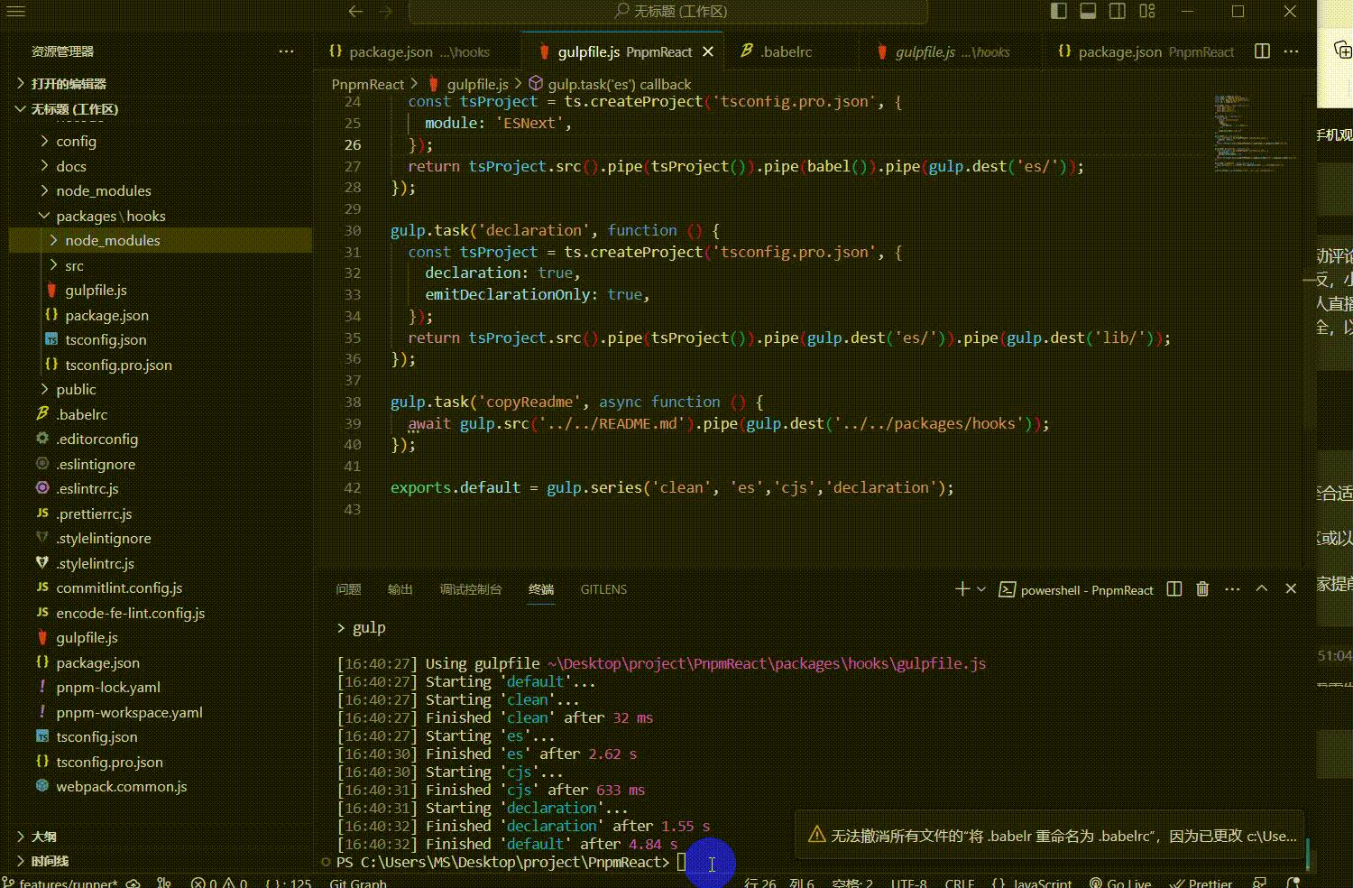 子目录 packages/hooks 中创建gulpfile.js 并且继承外层根目录下的