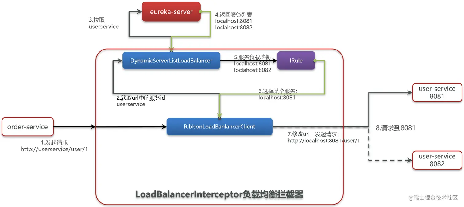- DynamicServerListLoadBalancer 根据 user-service 到 eureka 拉取服务列表