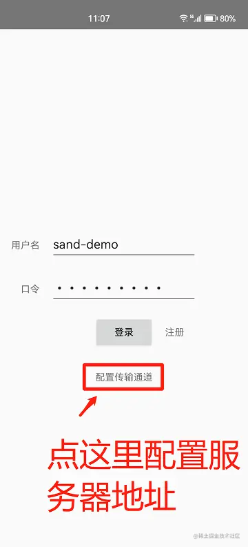 配置好传输通道后,回到登录页,使用sand-demo用户名来登录App。用户密码也是"sand-demo"。