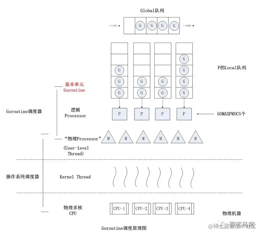 M必须拥有P才可以执行G中的代码,P含有一个包含多个G的队列,P可以调度G交由M执行。