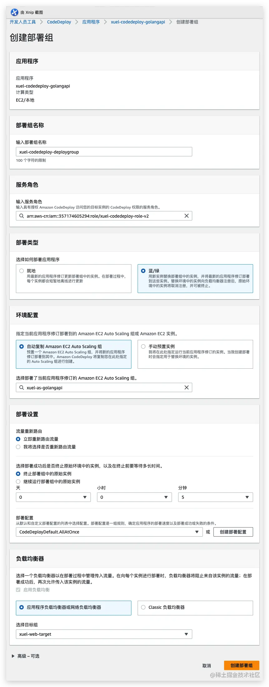 - 指定部署类型配置部署组,可以指定应用于实例的标签、Amazon EC2 Auto Scaling组名,需在实例中安装并正常运行CodeDeploy。