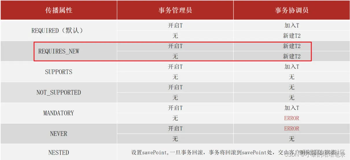 ● 这和我们的需求不符,这个时候我们就想能不能让log方法单独是一个事务呢?要想解决这个问题,就需要用到事务传播行为,所谓的事务传播行为指的是: