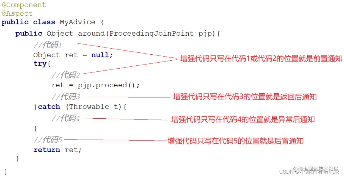 前置、后置、返回后、抛出异常后通知。▶ 环绕通知获取方式