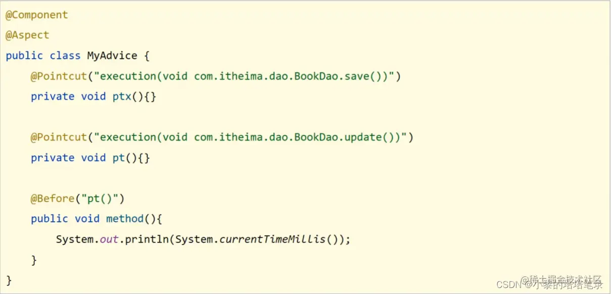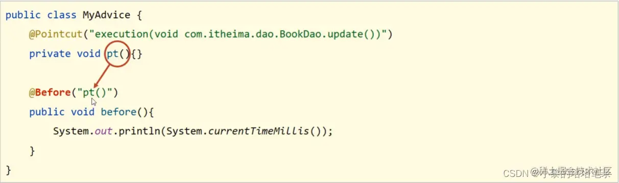 public class MyAdvice { @Pointcut("execution(void com.itheima.dao.BookDao.update())") private void pt(){} public void method(){ System.out.println(System.currentTimeMillis()); } }注意:切入点定义依托一个不具有实际意义的方法进行,即无参数、无返回值、方法体无实际逻辑。