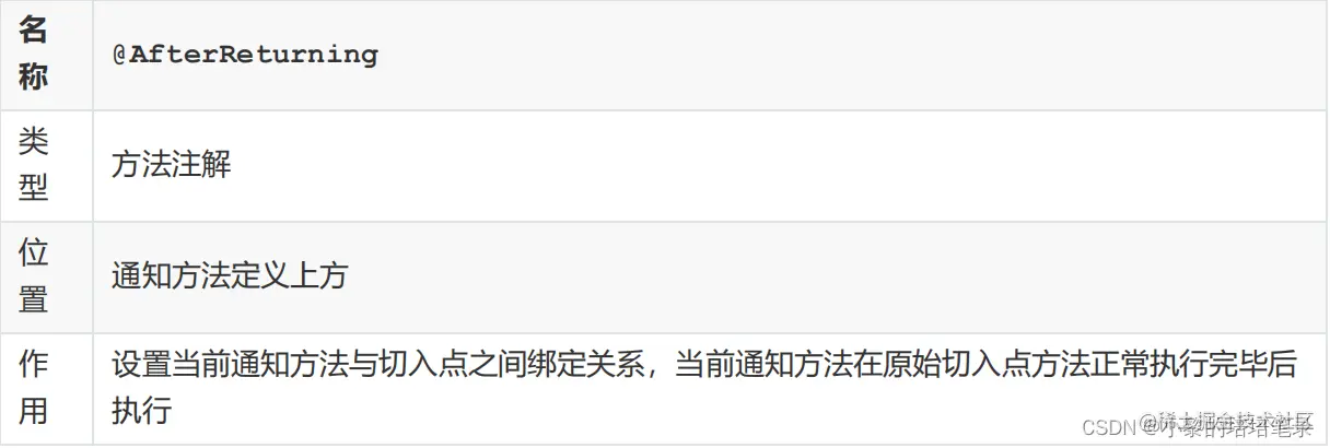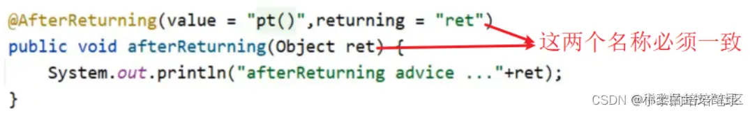 @Component @Aspect public class MyAdvice { @Pointcut("execution(* com.itheima.dao.BookDao.findName(..))") private void pt(){} @AfterReturning(value = "pt()",returning = "ret") public void afterReturning(Object ret) { System.out.println("afterReturning advice ..."+ret); } //其他的略 }注意: