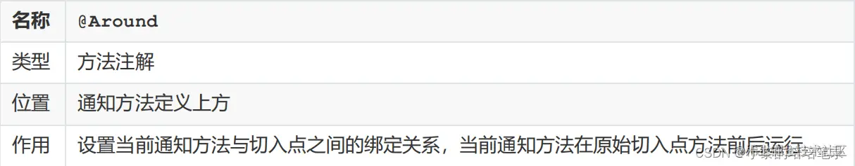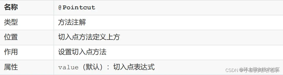 (4) 通知是要增强的内容,会有多个,切入点是需要被增强的方法,也会有多个,那哪个切入点需要添加哪个通知,就需要提前将它们之间的关系描述清楚,那么对于通知和切入点之间的关系描述,我们给起了个名字叫切面
