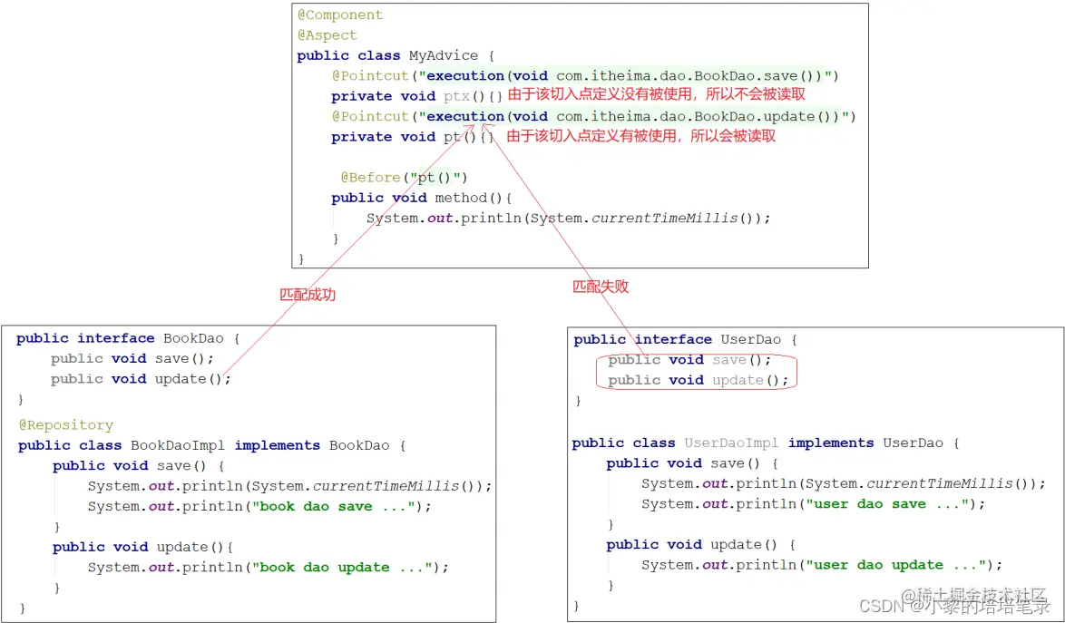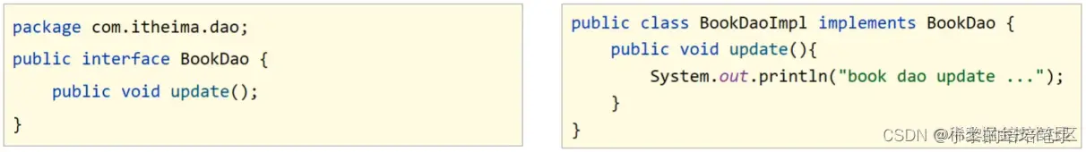 execution(void com.itheima.dao.impl.BookDaoImpl.update())因为调用接口方法的时候最终运行的还是其实现类的方法,所以上面两种描述方式都是可以的。