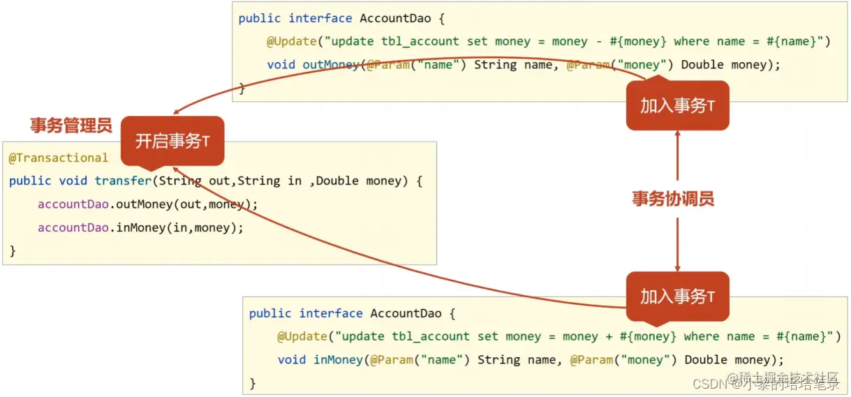 ● AccountDao的outMoney因为是修改操作,会开启一个事务T1