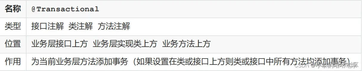 ● 事务协调员:加入事务方,在Spring中通常指代数据层方法,也可以是业务层方法注意 : 目前的事务管理是基于