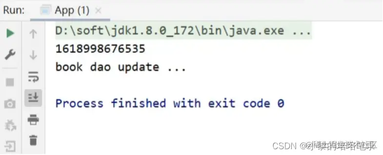 public class App { public static void main(String[] args) { ApplicationContext ctx = new AnnotationConfigApplicationContext(SpringConfig.class); BookDao bookDao = ctx.getBean(BookDao.class); bookDao.update(); } }看到在执行update方法之前打印了系统时间戳,说明对原始方法进行了增强,AOP编程成功。