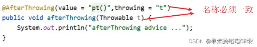 @Component @Aspect public class MyAdvice { @Pointcut("execution(* com.itheima.dao.BookDao.findName(..))") private void pt(){} @AfterThrowing(value = "pt()",throwing = "t") public void afterThrowing(Throwable t) { System.out.println("afterThrowing advice ..."+t); } //其他的略 }如何让原始方法抛出异常,方式有很多,