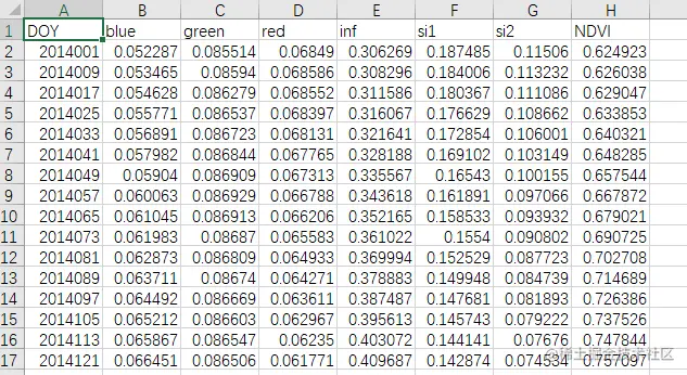 其中,每一个Excel表格文件都有着如下图所示的数据格式;其中的第1列,是表示天数的时间数据,每一行数据之间的时间跨度是8天。