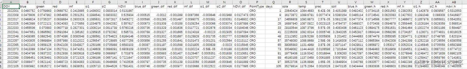 在处理历史数据时,首先找到与当前点ID匹配的历史数据文件,并使用Pandas中的 read_csv() 函数读取了该文件的数据。然后,使用 iloc[] 函数删除了第一列,并将剩余列重命名为blue_h、green_h、red_h、inf_h、si1_h、si2_h 和 ndvi_h。最后,使用Pandas中的 concat() 函数将筛选后的数据和历史数据合并成一个新的DataFrame。