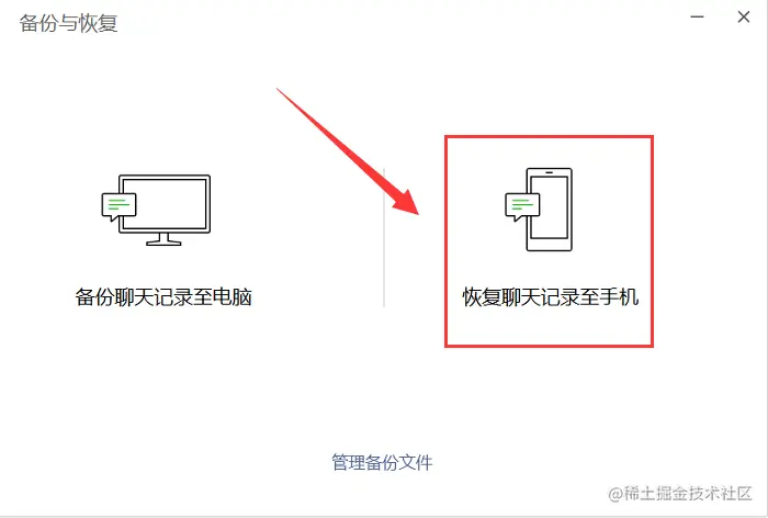 步骤2:在弹出页面中选择【备份与恢复】选项,然后点击【恢复聊天记录至手机】。