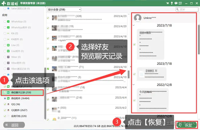 步骤2:与方法二的后续操作一样。挑选好之前被删除的聊天记录,然后点击【恢复】按钮,将聊天记录保存到电脑就可以了。