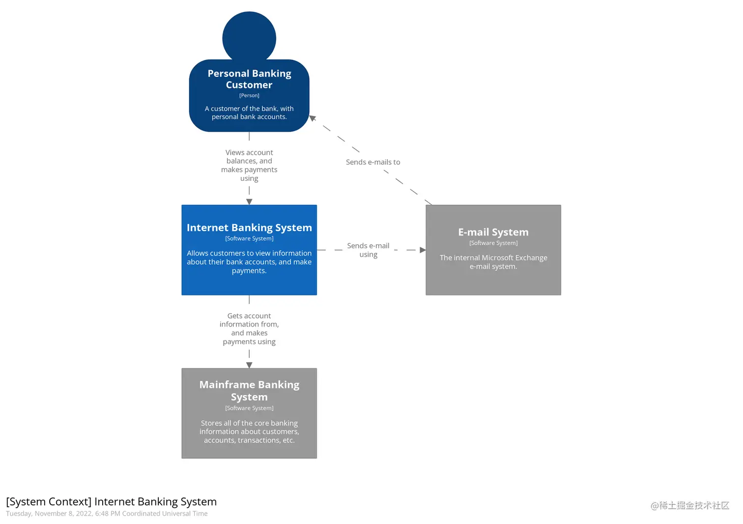 系统上下文图一词最早是从Simon Brown的C4模型中借用而来的,该模型”通过在不同的抽象层次重新定义方框和虚线来抽象表达架构的含义“。