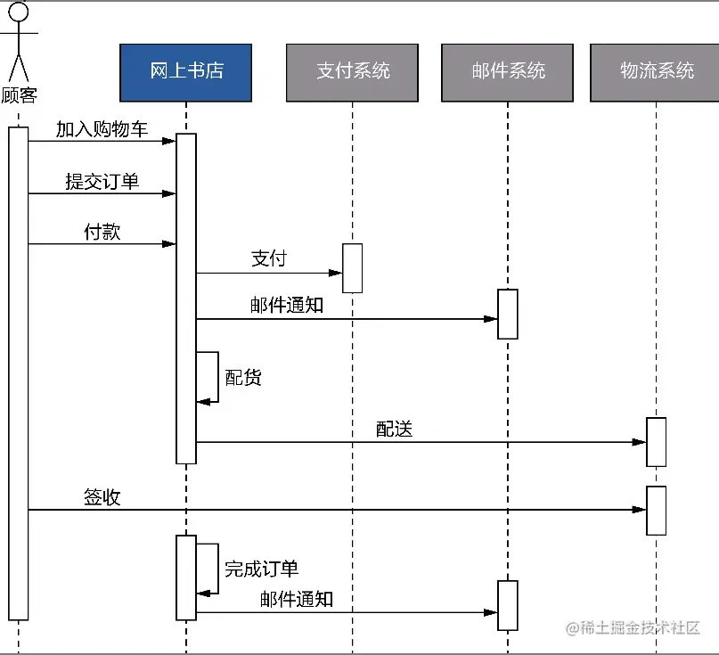 除了参考以上的画法,也可以用业务序列图表示。它脱胎与UML的序列图。序列图可以从左侧的角色开始,体现消息传递的次序。这隐含这一种驱动力:我们从左侧的参与对象开始,寻找与之协作的执行步骤,然后层层传进地推导出整个完整的协作流程。