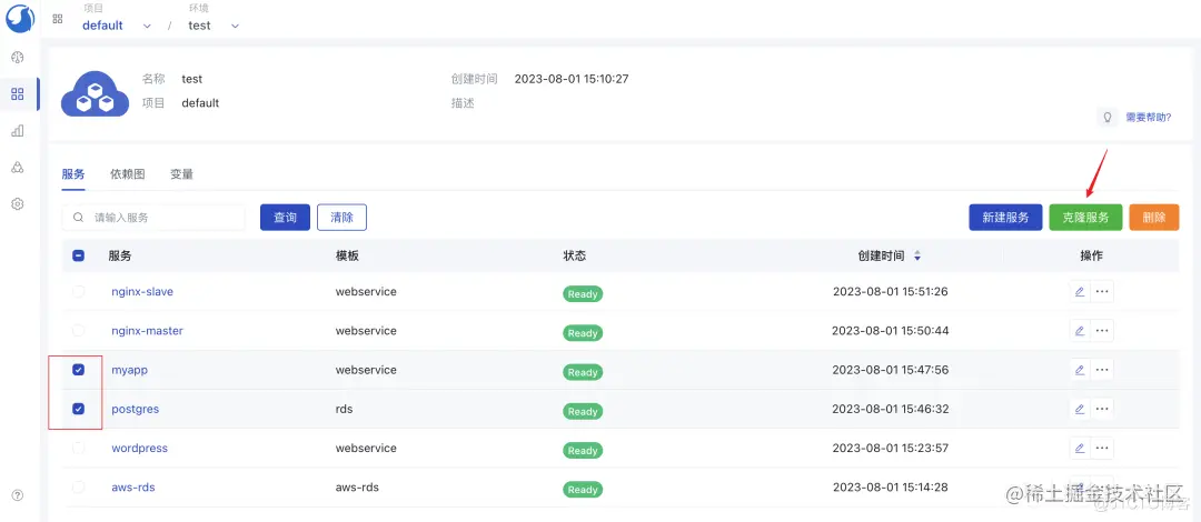 Walrus 支持批量克隆服务和环境。用户可以轻松复制现有的服务配置到单个或多个目标环境,同时支持克隆服务的参数定义,可以根据现有环境的配置及服务,快速创建一个新的环境,包括环境中的应用相关服务及基础设施资源。