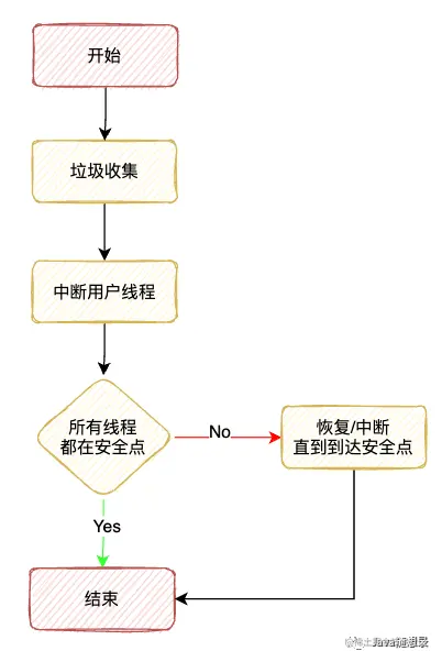 - 「抢先式中断」:不需要线程的执行代码主动去配合,在垃圾收集发生时,系统首先把所有用户线程全部中断,**如果发现有用户线程中断的地方不在安全点上,就恢复这条线程执行,让它一会再重新中断,直到跑到安全点上。**现在几乎没有虚拟机实现采用抢先式中断来暂停线程响应GC事件。