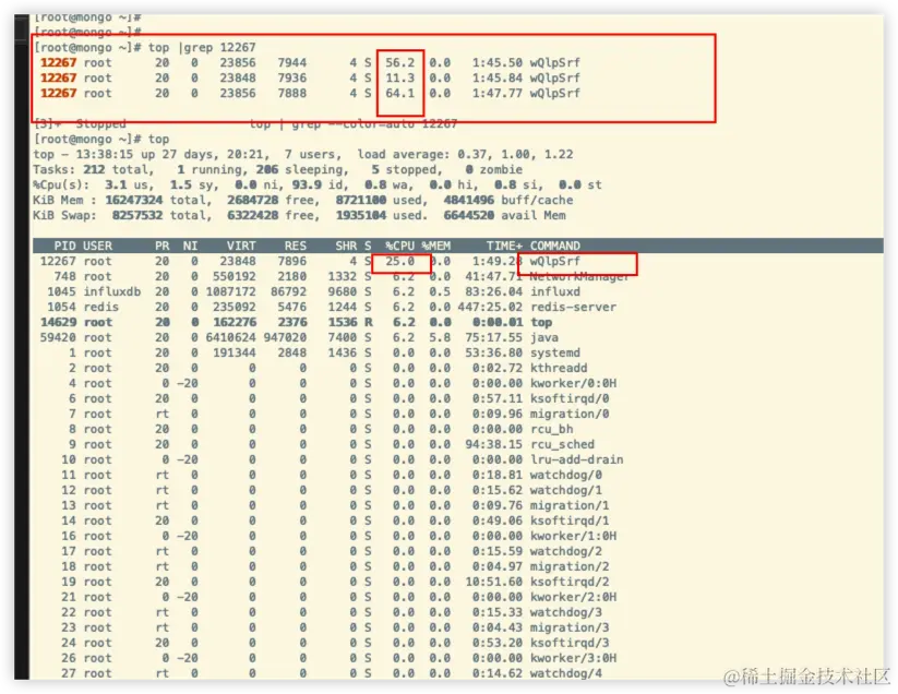 kill掉这些进程后,过几秒后,进程会再次启动,只是名字有所改变,并且通过查看这个进程的cpu使用情况,发现cpu的占用率也比较高,基本能达到30%