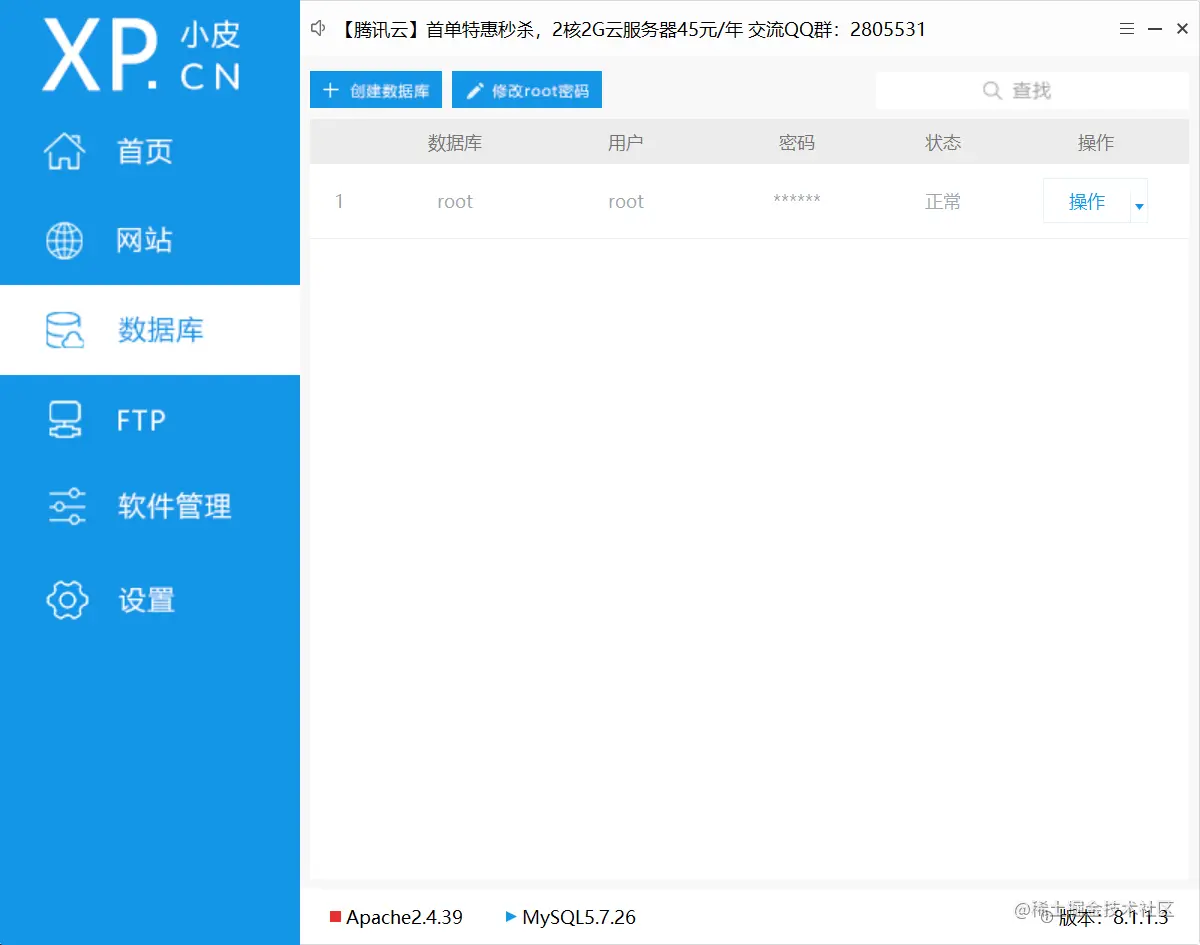 3、可以在数据库选项栏中对数据库进行一些操作,如创建新数据库,更改密码等。