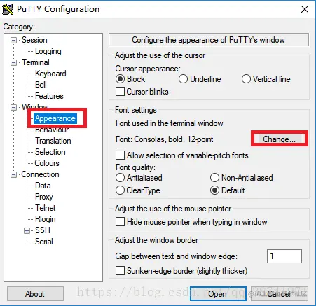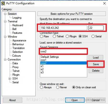 6.下次再启动putty点击cos2,点击open即可,不需要再重新设置字体样式和起前景色背景色