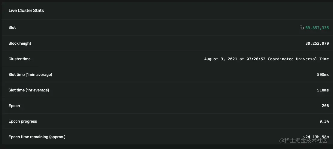而在Solana中,epoch对应触发PoH generator (leader)切换的时间,目前对应为208个slot。(一个slot对应leader产块的时间间隔。)每个epoch对应的物理时间为2~3天。