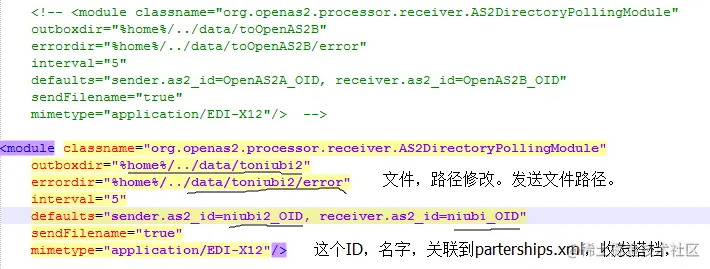 2. 发送文件路径的配置,以及sender.as2_id,receriver.as2_id 的配置,关联到partnerships.xml.