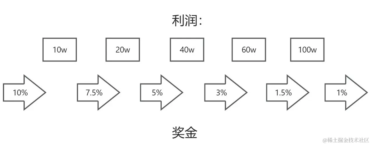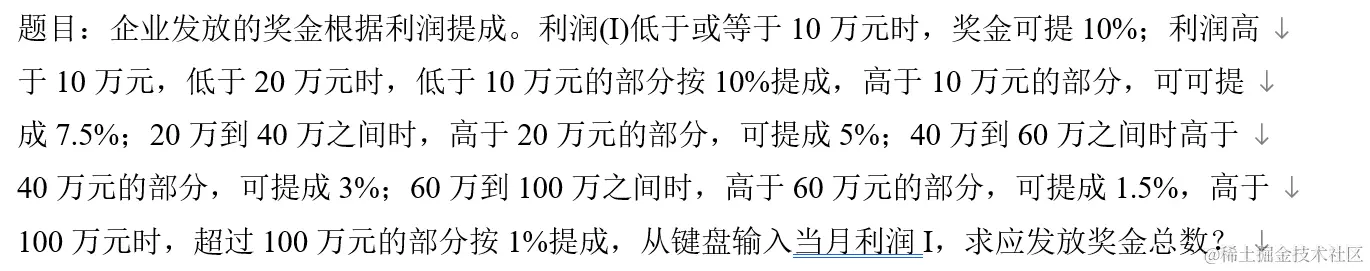 这时,定义一个变量i用于存储输入的信息(即利润),再用几个变量分别记录当利润达到10w、20w、40w、60w、100w时对应的奖金,计算输入的利润和他所在的利润范围的下限之差,然后与该范围的提成和下限对应的奖金之和即为所求,代码见下: