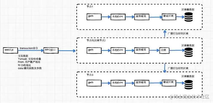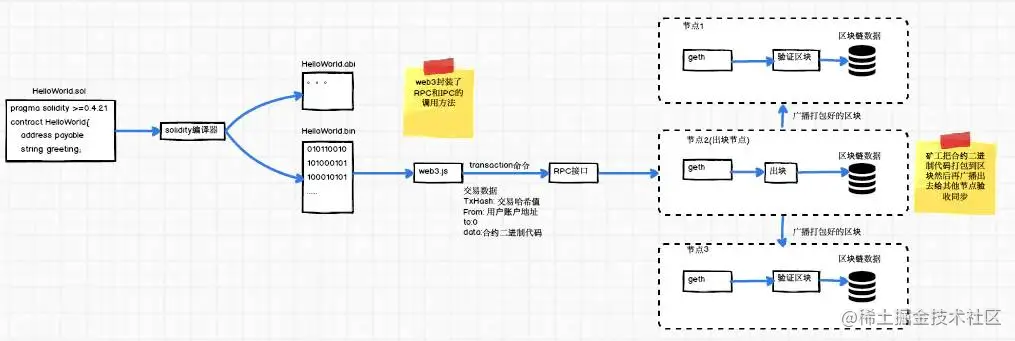 - 智能合约是部署在区块链的代码,区块链本身不能执行代码,代码的执行是在本地的EVM中,实际上,部署在区块链上代码是能够在本地产生原智能合约代码的代码,可以理解区块链为一个数据库,而客户端从数据库中读取了存储的运行代码,并在本地运行后,将结果写入到了区块链这个数据库中。