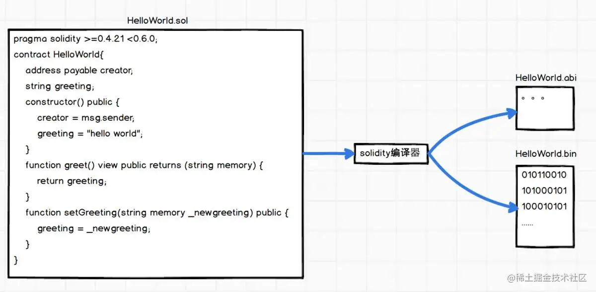 如上图合约文件 Helloworld.sol,经过编译器编译生成 Helloworld.abi 和 Helloworld.bin 文件。