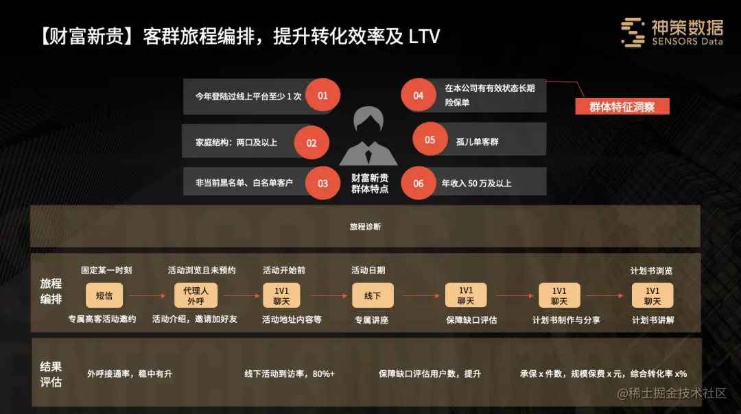 值得一提的是,在进行客户旅程编排的过程中我们发现:差异化客群洞察是客户旅程编排的必要环节,保险企业可以针对不同的客群策划个性化的营销策略,以提升转化效率和 LTV。