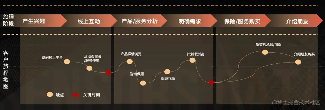 具体来看,该客户旅程地图包括客户访问保险企业线上平台、客户浏览活动页并留资或者客户使用了某个功能服务,客户浏览了某个保险产品详情页,客户对产品感兴趣并咨询了保顾、客户跟保顾持续互动,保顾为客户制作计划书,客户浏览计划书,客户完成了新契约承保,客户把产品介绍给朋友等多个阶段。