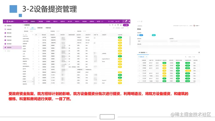 为了解决这个问题,我们使用明道云建立了一个设备管理系统。这个系统可以生成相关报表,让大家可以查看院方提供了哪些设备,哪些设备还未提资,以及每个房间的设备提资要求。这些要求可能包括设备的新旧程度、毛坯交付还是精装交付等,我们将这些标准传达给设计院,让他们按照标准进行设备出图和落地,以确保每台设备都能完美安装。因为每台设备的价格可能从几百万到几千万甚至上亿不等,所以我们需要确保设备的完整落位。