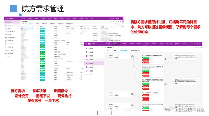 像我们之前管理的南山医院,在建设过程中每天可能会有1到2条,甚至3到4条需求提出,一年下来可能有几百上千条需求,我们需要确保每一条需求都能得到落实,因此,我们使用明道云的各种视图报表,将院方需求从提出决策到执行再到最后的下发都进行了分类整理。这样做有两个好处。首先,对于院方来说,我们可以告诉他们每一条需求的执行情况;其次,我们将这个数据库与其他项目进行沟通和公布,让其他项目的小伙伴了解院方在某些科室、领域关注什么,这样我们这些只懂建筑而不懂医疗的人也能通过这个数据库了解院方的需求。