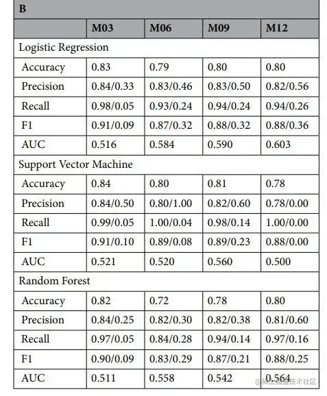 所有 3 种模型在第 3 个月时准确率最高 (0.82-0.84) ,且预测通过猎犬的 F1 分数较高 (0.90-0.91)。然而,它们在第 3 个月时预测未通过猎犬的表现都不佳(F1≤0.10)。