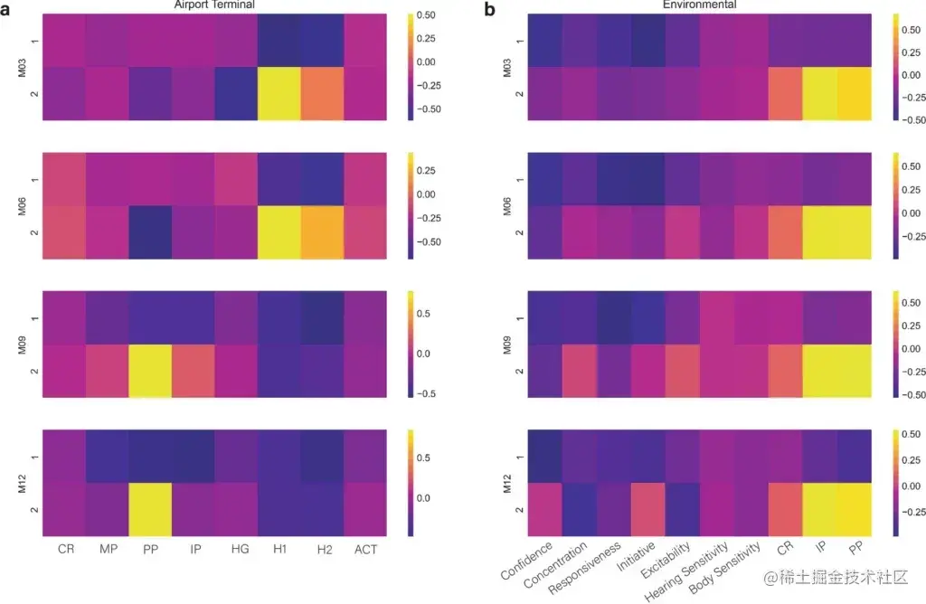 如上图 a 所示, 在 AT 测试中,第 3 个月和第 6 个月的测试数据显示,影响最大的特性是 H1/2 (Hidden 1/2),而在第 9 个月和第 12 个月的测试数据中,物理占有 (Physical Posession, PP) 影响最大。上图 b 显示,在 Env 测试中,玩具独立占有 (Independent Possession, IP) 在所有时间点的影响最大。
