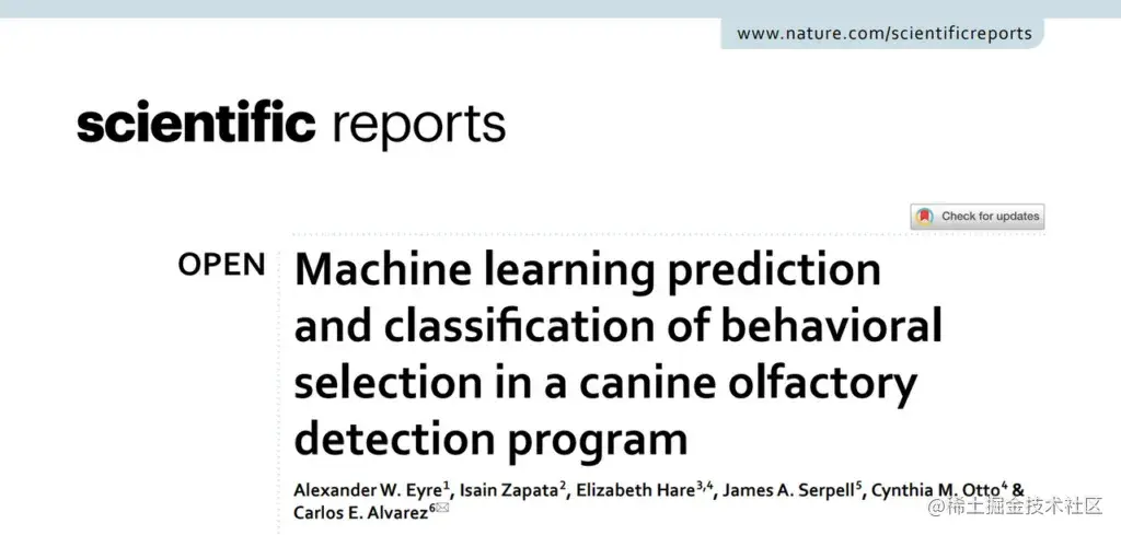 目前该研究已发布在《Scientific Reports》期刊上,标题为「Machine learning prediction and classification of behavioral selection in a canine olfactory detection program」。