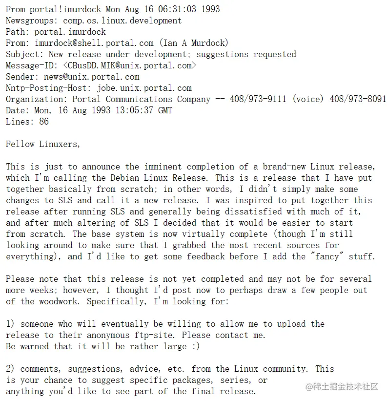 30年前,已故的Ian Murdock写信给comp.os.linux.development新闻组,讲述了一个全新的linux版本的完成,他将其命名为“Debian linux版本”。