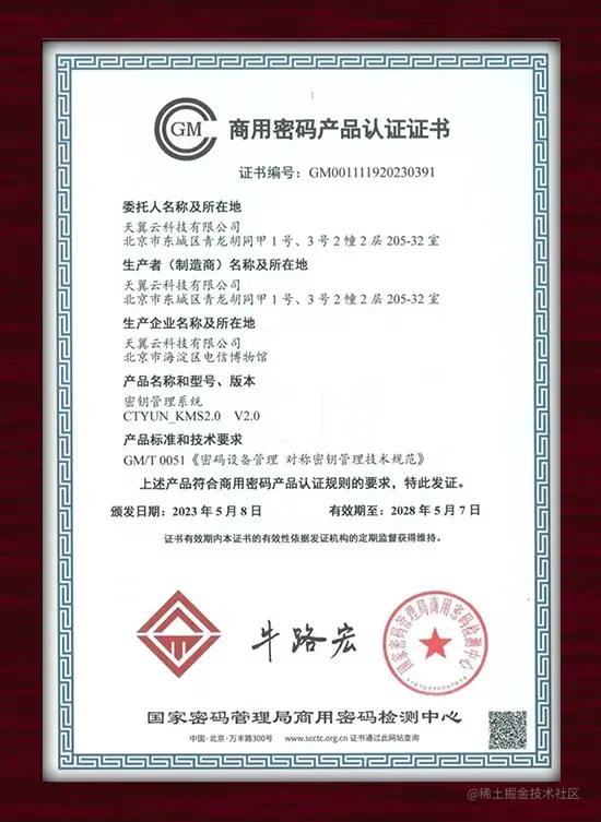 日前,天翼云自研密钥管理系统(KMS)通过国家密码管理局安全性审查,符合GM/T 0051《密码设备管理 对称密钥管理技术规范》要求,获得由国家密码管理局商用密码检测中心颁发的《商用密码产品认证证书》,天翼云也成为业内首-个获得该证书的主流云厂商。