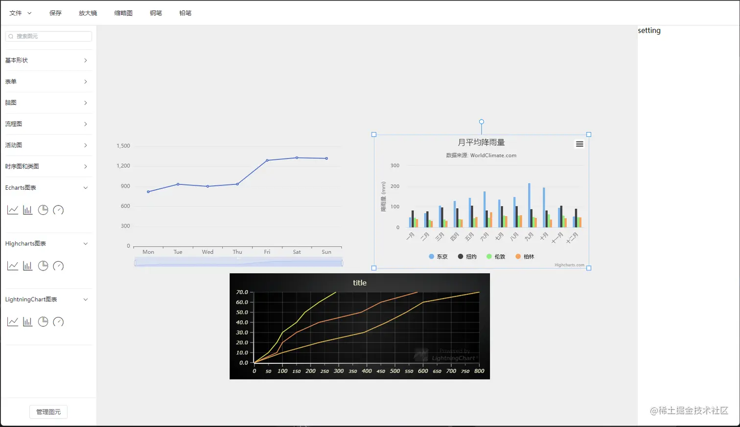 | Echarts、hightcharts、lightningchart | @meta2d/chart-diagram | 需在html中手动引入相关charts,详见官方文档 |