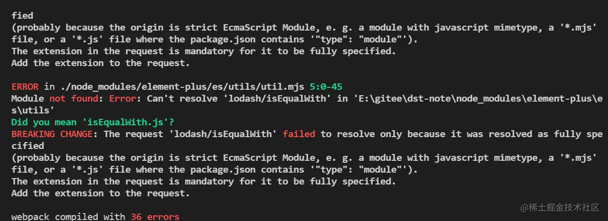 当前打包使用Vite,项目正常启动,如果是Webpack打包,运行npm run dev,可能会出现与Element-Plus相关的报错信息,如下所示: